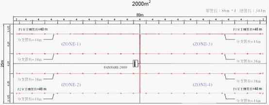 下圖是防火分區(qū)2000m2,使用FANFARE-2000探測主機,分為4個探測區(qū)域(每區(qū)500m2),采樣孔保護面積25.2m2的管路設計圖
