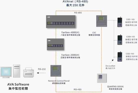 FANFARE-2000四區(qū)型極早期煙霧偵測主機,可以通過輸入模塊接入火災自動報警報警控制器;也可以全部聯(lián)網(wǎng),并由AVA系統(tǒng)管理軟件對整個系統(tǒng)進行設置和監(jiān)控。AVA系統(tǒng)管理軟件安裝在消防控制室的計算機上,用戶可以通過它對整個探測系統(tǒng)的所有性能進行設置、調(diào)試和監(jiān)控。