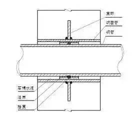 1.剛性套管安裝:主體結(jié)構(gòu)鋼筋綁扎好后,按照給排水施工圖標(biāo)高幾何尺寸找準(zhǔn)位置,然后將套管置于鋼筋中,焊接在鋼筋網(wǎng)中,如果需氣割鋼筋安裝的,安裝后必須用加強(qiáng)筋加固,并做好套管的防堵工作。剛性套管安裝如圖所示: